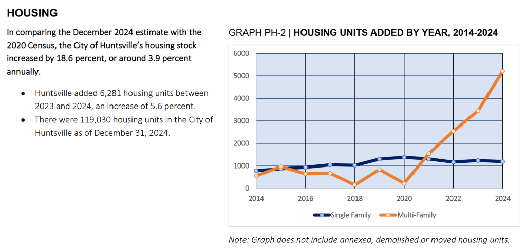 Huntsville was featured on NPR as an example of a growing city with very affordable housing. Its true. Huntsville is growing rapidly while housing and rent costs for the past 5 years have been flat or even declining. A big part of this is due to the explosive growth of housing inventory. When housing inventory grows with the population, housing costs remain stable.