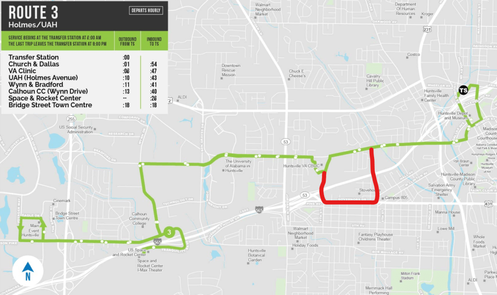 You can now take the bus to and from the Stovehouse area. There are new bus stop signs for Route 3 in front of the Foundry apartments and in front of the Food city.