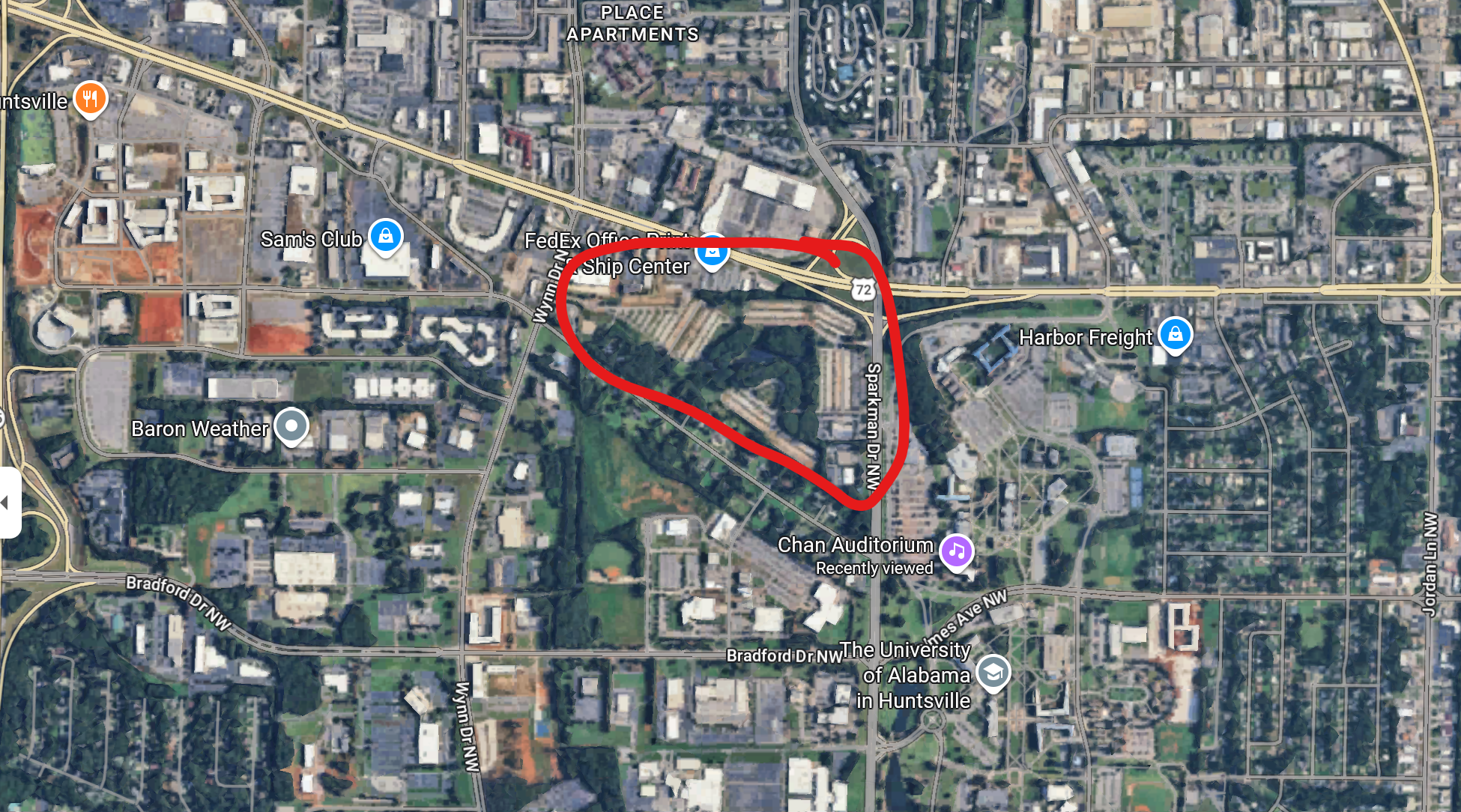 - Routing from Social Security Office – Continue Research Drive / Corporate Dr, Left (north) on Old Monrovia, Right on University, left on Sparkman Drive, Right Executive Drive, Left Ascent Trail, Left Bonnell, Right Sparkman to regular route.